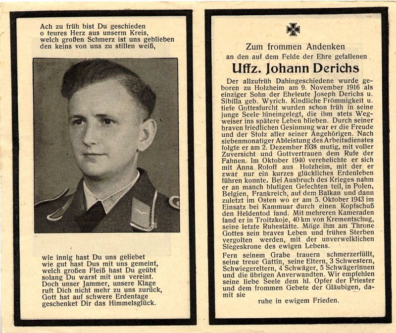 | Gefallener 2. Weltkrieg; Eltern: Joseph Derichs u. Sibilla geb. Wyrich; 2.12.1938 Einberufung; ∞ Okt. 1940 Anna Roloff aus Holzheim; Ruhestätte in Troitzkoje, 40 km von Krementschug |