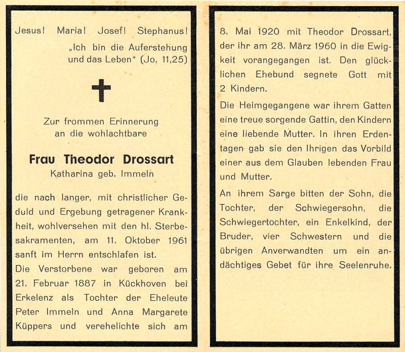 Peter Immeln u. Anna Margarete geb. Küppers; ∞ 8.5.1920 Theodor Drossart, † 28.3.1960; 2 überlebende Kinder |