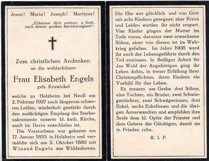 Längeres schweres Leiden; ∞ 2.10.1880 Winand Engels aus Widdeshoven; 8 K., davon 4 †, darunter 2 erwachsene Söhne, einer im 1. Weltkrieg gefallen; |