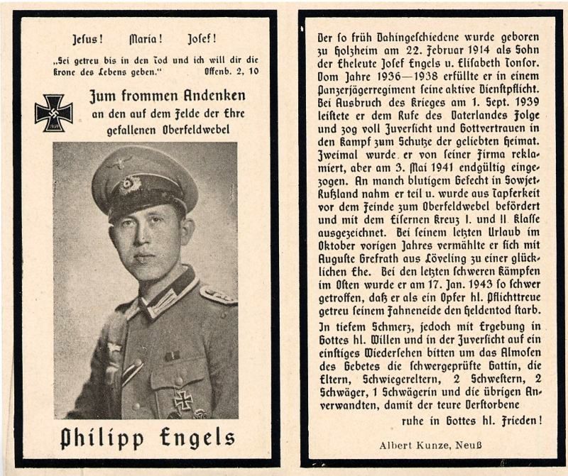 Gefallener 2. Weltkrieg; Eltern: Josef Engels u. Elisabeth geb. Tonsor; Einberufung 1.9.1939; zweimal von seiner Firma reklamiert; 3.5.1941 endgültig eingezogen (Russland); bei letztem Urlaub im Okt. 1942 ∞ Auguste Grefrath aus Löveling |