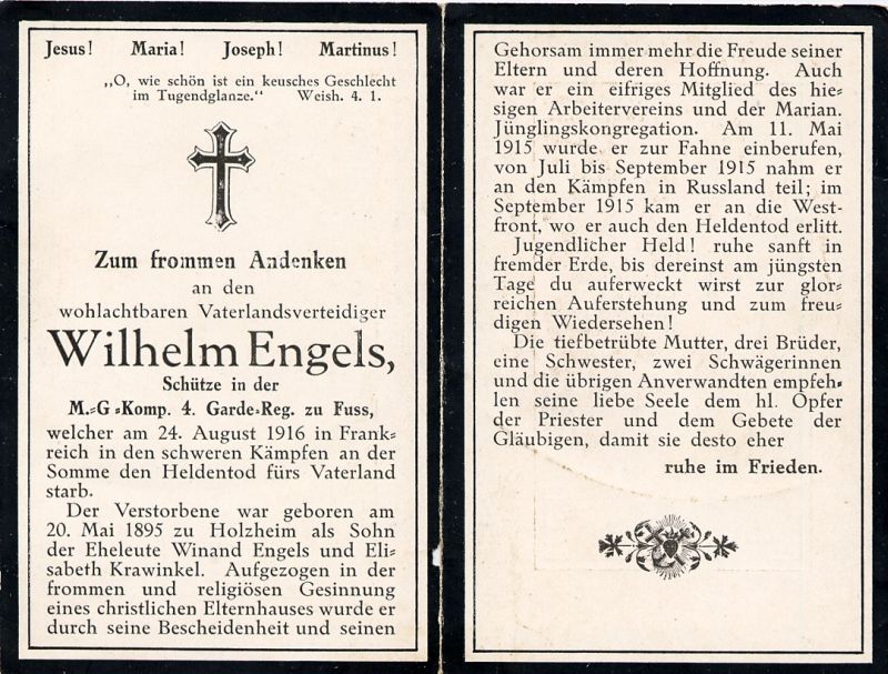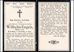 Gefallener 1. Weltkrieg; Eltern: Winand Engels u. Elisabeth geb. Krawinkel; Einberufung 11.5.1915; Juli bis Sept. 1915 Kämpfe in Russland; Sept. 1915 an die Westfront |