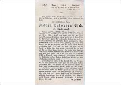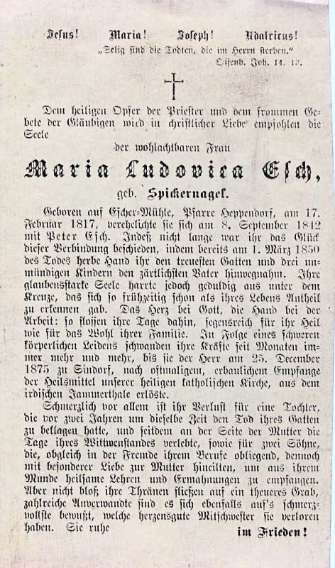 ∞ 8.9.1842 Peter Esch, † 1.3.1850; 3 K.; schweres körperliches Leiden; 1 Tochter seit 2 J. verwitwet, lebte seitdem bei ihr |