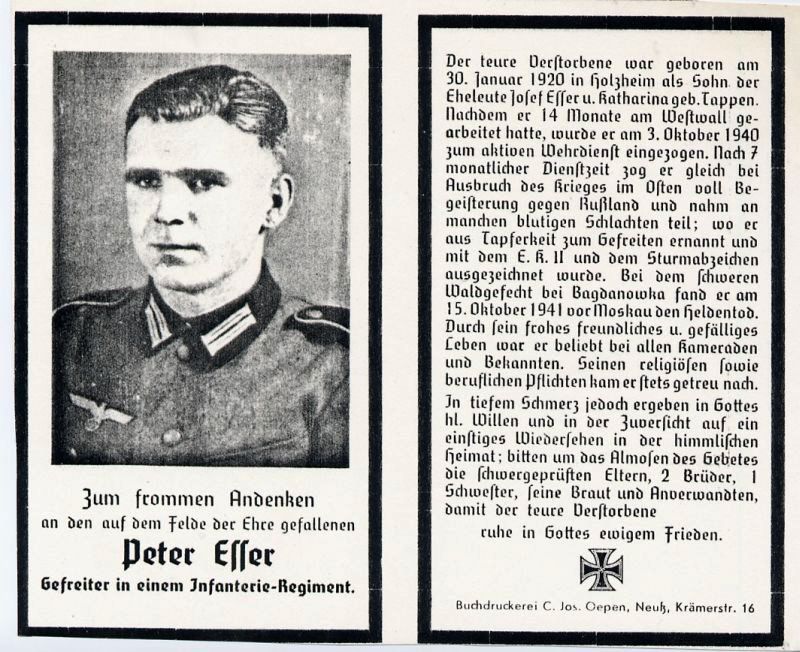 Gefallener 2. Weltkrieg; Eltern: Josef Esser u. Katharina geb. Tappen; nach 14 Monaten Westwall Einberufung am 3.10.1940; schweres Waldgefecht b. Bagdanowka; verlobt |