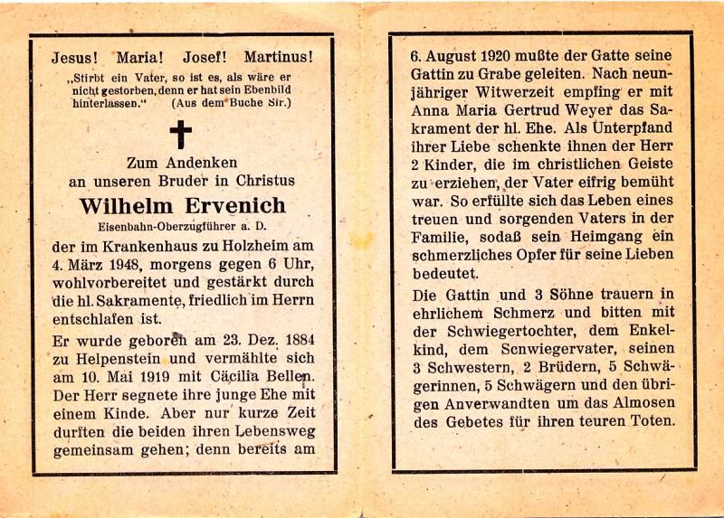 Eisenbahn-Oberzugführer a.D.; ∞ 10.5.1919 Cäcilia Bellen, † 6.8.1920; 1 K.; ∞ nach 19. J. Witwerzeit Anna Maria Gertrud Weyer; 2 K. |
