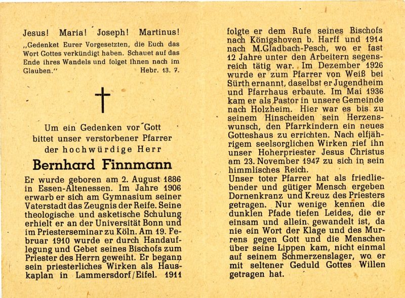 Priesterweihe Köln 19.2.1910; Hauskaplan Lammersdorf/Eifel; 1911 Kaplan Königshoven b. Harff, 1914 Mönchengladbach-Pesch (12 J.); Mai 1936 Pfarrer in Holzheim; schmerzhaftes Krankenlager |