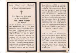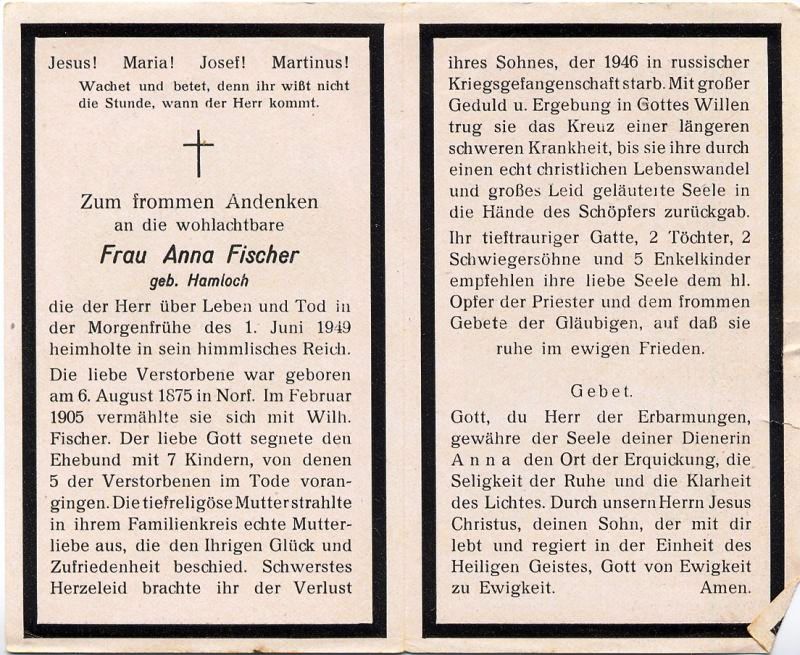 ∞ Febr. 1905 Wilhelm Fischer; 7 K., davon 5 † (davon 1 Sohn 1946 in russ. Kriegsgefangenschaft †), Opfer 2. Weltkrieg; vermutlich aus Holzheim |