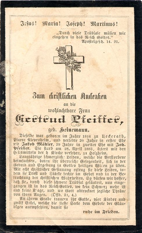 20 J. in 1. Ehe mit Jakob Mähler, 29 Jahre in 2. Ehe mit Johann Pfeiffer; langjähriges,schmerzhaftes Leiden; 4 überlebende K. |