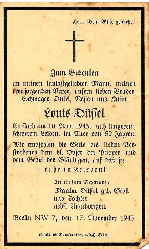 | 52 J.; längeres, schweres Leiden; ∞ Martha Stoll; 1 Tochter; gedruckt in Trier |
