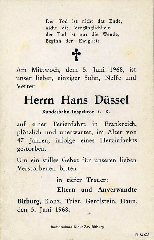 | Wohnort: Bitburg; Herinfarkt auf Ferienfahrt in Frankreich; 47 J.; Bundesbahn-Inspektor i.R. |