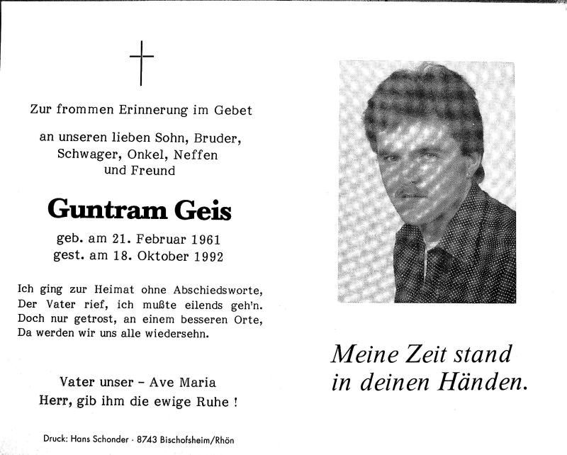 | Totenzettel-Nr.: | 24847 |  | Name: | Geis |  | Vorname: | Guntram |  | Geburtsdatum: | 21.02.1961 |  | Sterbedatum: | 18.10.1992 |  | Bearbeiter: | H. J. Rosenbaum (Bilder) / J. Wißkirchen (Text) |  | Sammlung: | Heinz Josef Rosenbaum, Grevenbroich |  | Sonstiges: |  | Druck in Bischofsheim, Rhön |  |