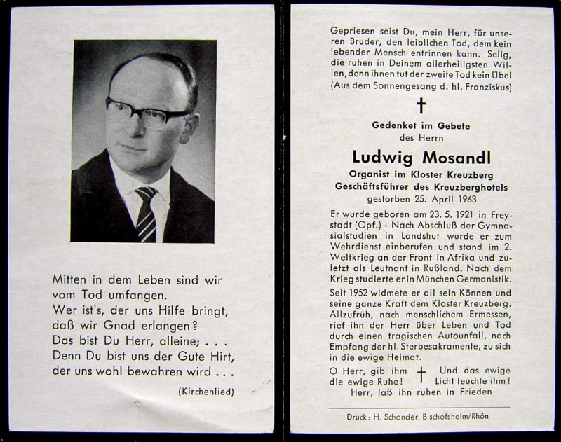 Organist im Kloster Kreuzberg; Geschäftsführer des Kreuzberghotels; Gymnasium in Landshut; Leutnant im 2. Weltkrieg; nach 1945 Studium der Germanistik in München; seit 1952 widmete er seine Kraft dem Kloster Kreuzberg; Tod durch Autounfall; Druck in Bischofsheim/Rhön |