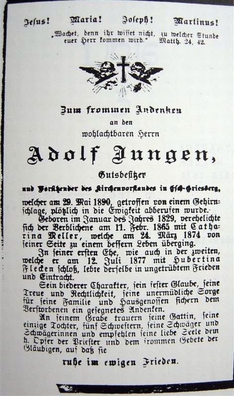 Gutsbesitzer u. Vorsitzender d. Kirchenvorstandes in Esch-Griesberg; ∞ 11.2.1865 Catharina Meller, † 24.3.1874; ∞ 12.7.1877 Hubertina Flecken; 1 Tochter |
