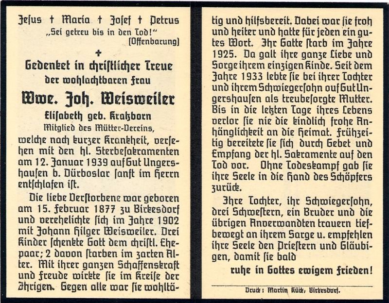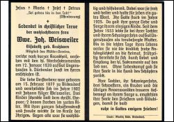 ∞ 1902 Johann Hilger Weisweiler, † 1925; 3 K.. Davon 2 früh †; Mitgl. Mütterverein |