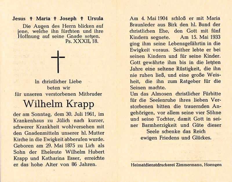 Eltern: Wilhelm Hubert Krapp u. Katharina geb. Esser; ∞ 4.5.1904 Maria Braunleder aus Birk, † 15.5.1933; 5 K. |