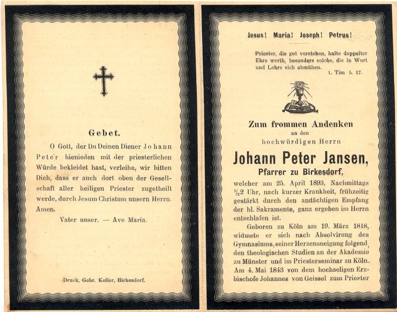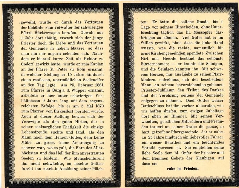 Priesterweihe 4.5.1843 Köln; 1 J. Verwalter Pfarre Hückeswagen; Rektor zu Godorf; 15 J. Kaplan an St. Peter, Köln; 25.2.1861 Pfarrer in Burg a.d. Wupper; ab 3.5.1870 Pfarrer von Birkesdorf; |