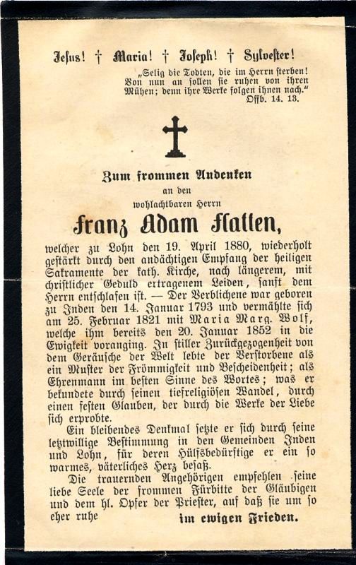 ∞ 25.2.1821 Maria Marg. Wolf, † 20.1.1852; ein bleibendes Denkimal setzte er sich durch seine letzwillige Bestimmung in den Gemeinden Inden und Lohn, für deren Hilfsbedürftige er ein so warmes Herz besaß |