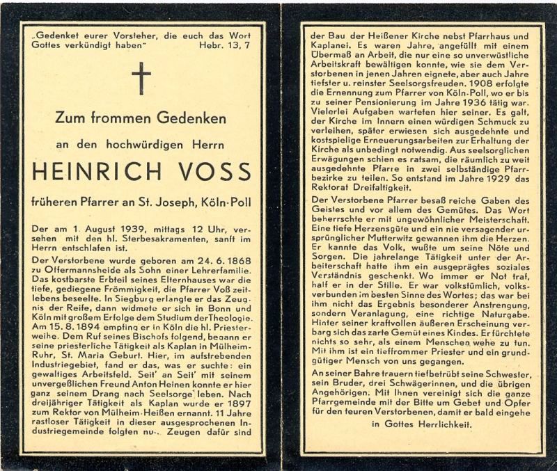 Priesterweihe Köln 15.8.1894; 3 J. Kaplan in Mülheim-Ruhr, St. Maria Geburt; hier befreundet mit Anton Heinen; 11 J. 1897 Rektor von Mülheim-Heißen: Bau von Kirche, Pfarrhaus, Kaplanei; 1908 bis Pensionierung 1936 Pfarrer in Köln-Poll; dort Gründung des Rektorats Dreifaltigkeit |