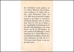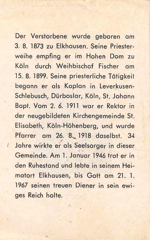 Priesterweihe 15.8.1899; Kaplan in Leverkusen-Schlebusch, Dürboslar, Köln St. Johann Baptist; 2.6.1911 Rektor der neuen Kirchengemeinde St. Elisabeth, Köln-Höhenberg; 26.8.1918 dort Pfarrer; 1.1.1946 Ruhestand;b lebte danach in seinem Heimatort |