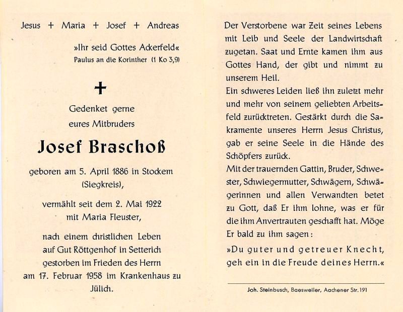 | ∞ 2.5.1922 Maria Fleuster; lebte auf Gut Röttgenhof in Setterich; Landwirt; zuletzt schweres Leiden; kinderlos |
