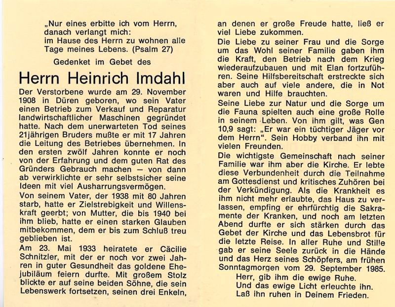 | Nach Tod des 21-jährigen Bruders übernahm er vom Vater (†1938 mit 80 J.) den Betrieb zum Verkauf und Reparatur von Landmaschinen; Mutter bis 1940 bei ihm; ∞ 23.5.1933 Cäcilie Schnitzler; 2 Söhne; Hobby der Jägerei |