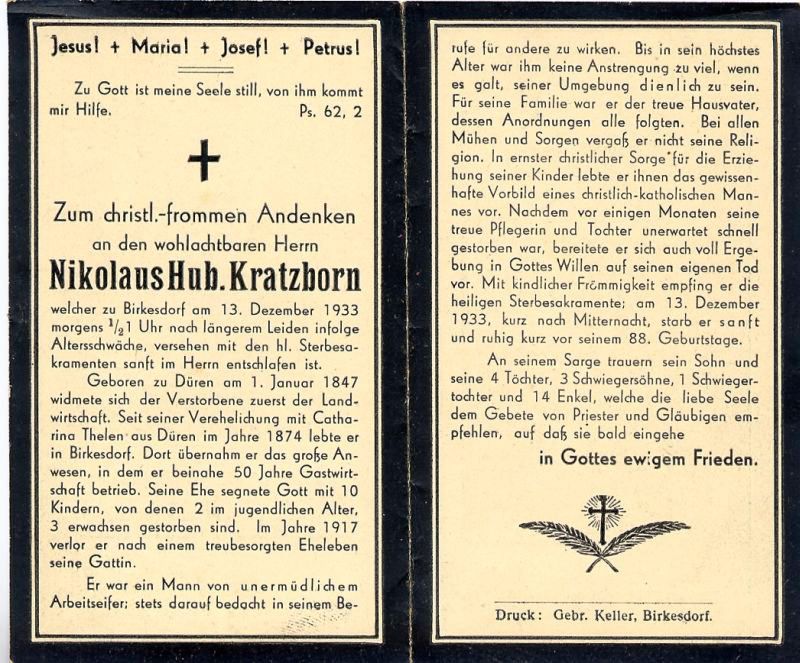 | Landwirt; ∞ 1874 Catharina Thelen in Düren, †191; übernahm in Birkesdorf das große Anwesen; 10 K., davon 2 früh, 3 erwachsen †; |