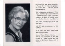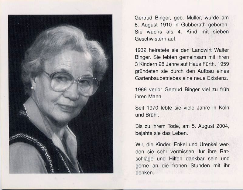 ∞ 1932 Landwirt Walter Binger, † 1966; 3 K.; 28 J. auf Haus Fürth; 1959 neue Existenz durch Neugründung eines Gartenbaubetriebs; lebte seit 1970 in Köln und Brühl |