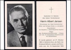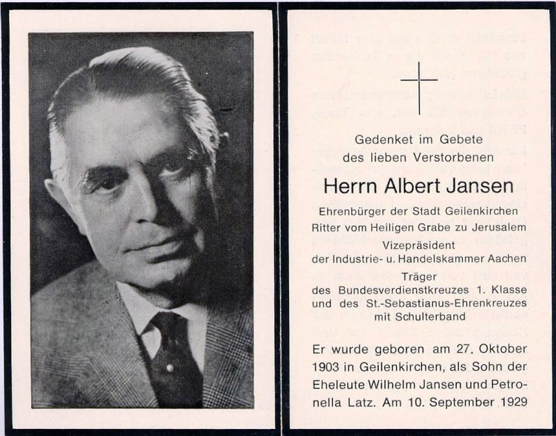 Ehrenbürger Stadt Geilenkirchen; Ritter vom Hl. Grab; Vizepräs. D. IHK Aachen; Bundesverdienstkreuz; St.-Sebastianus-Ehrenkreuz; Eltern: Wilhelm Jansen u. Petronella geb. Latz; ∞ 10.9.1929Else Mundt aus Düren |