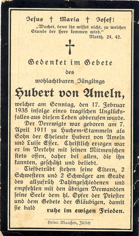 Tod durch Unglücksfall; Eltern: Hubert von Ameln u. Luise geb. Esser |