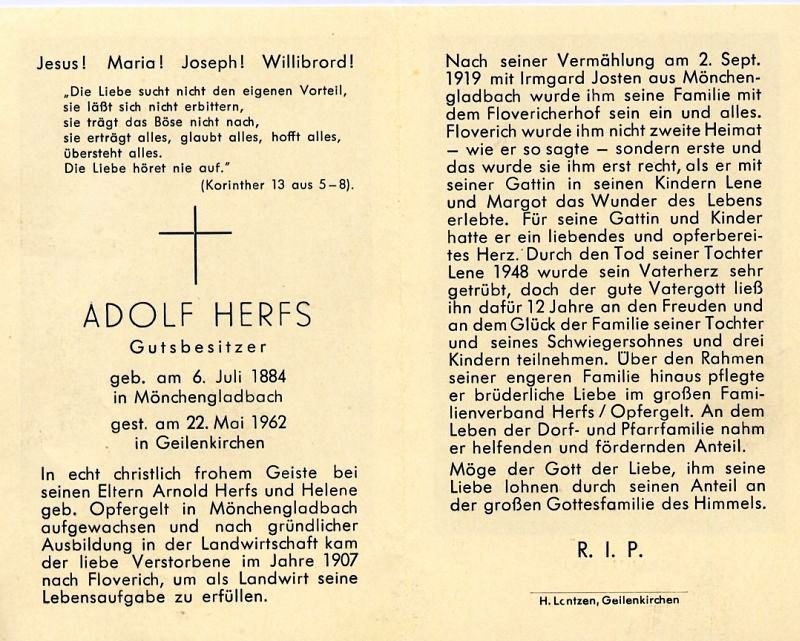 | Gutsbesitzer; Eltern: Arnold Herfs u. Helene geb. Opfergelt; Ausbildung als Landwirt; 1907 nach Floverich, seine 2. Heimat; ∞ 2.9.1919 Irmgard Josten aus Mönchengladbach; 2 K.: Lene, †1948, u. Margot; großer Familienverband Herfs/Opfergelt; Druck in Geilenkirchen |