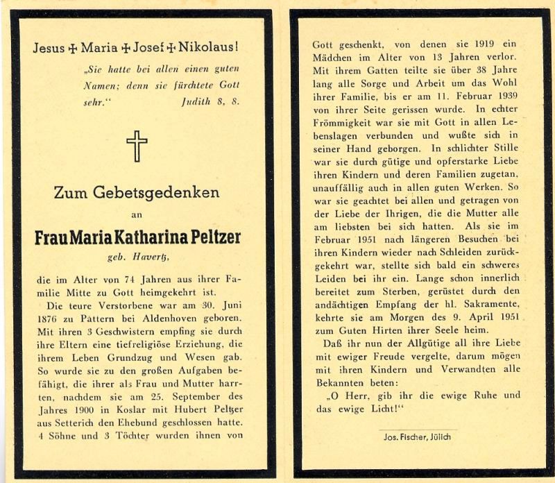 | ∞ 25.9.1900 in Koslar Hubert Peltzer aus Setterich, †11.2.1939; 7 K., davon 1 T. mit 13 J. †1919; lebte zuletzt offenbar in Schleiden; Druck in Jülich |