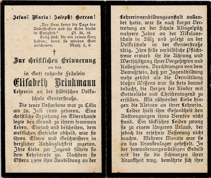 Lehrerin an der städt. Volksschule Genterstraße in Köln; bis 1908 Ausbildung Lehrerinnenbildungsanstalt; kurze Vertretung an der Schule Klingelpütz; dann mehrere Jahre Nikolausschule in Sülz; tückisches Leiden; mehrmonatiges Krankenlager |