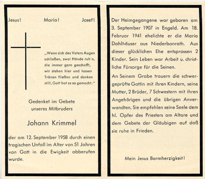Tod durch Unfall; ∞ 18.2.1941 Maria Dahlhäuser aus Niederbonrath; 2 K. |