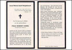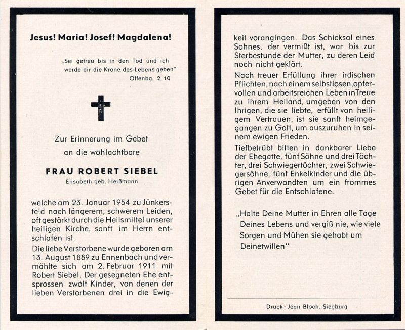 ∞ 2.2.1911 Robert Siebel; 12 K., davon 3 †; 1 Sohn im 2. Weltkrieg vermisst; Druck in Siegburg |