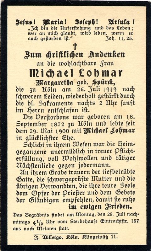 Schweres Leiden; ∞ 29.5.1900 Michael Lohmar |