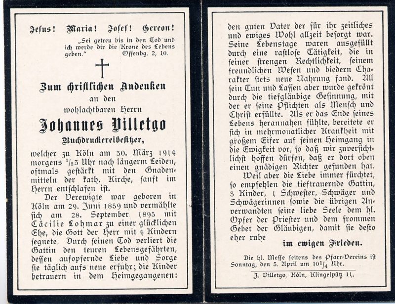 Buchdruckereibesitzer; längeres Leiden; ∞ 28.9.1895 Cäcilie Lohmar; 4 K., davon 1 † ; mehrmonatige Krankheit |