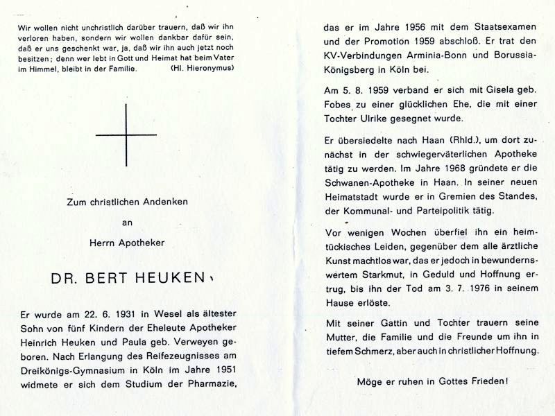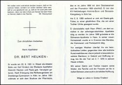 | Eltern: Apotheker Heinrich Heuken u. Paula geb. Verweyen; Apotheker; ∞ 5.8.1959 Gisela Fobes; 1 T. Ulrike; übernahm in Haan, Rhld., arbeitete in Apotheke des Schwiegervaters; gründete 1968 Schwanen-Apotheke in Haan; heimtüvkisches Leiden |