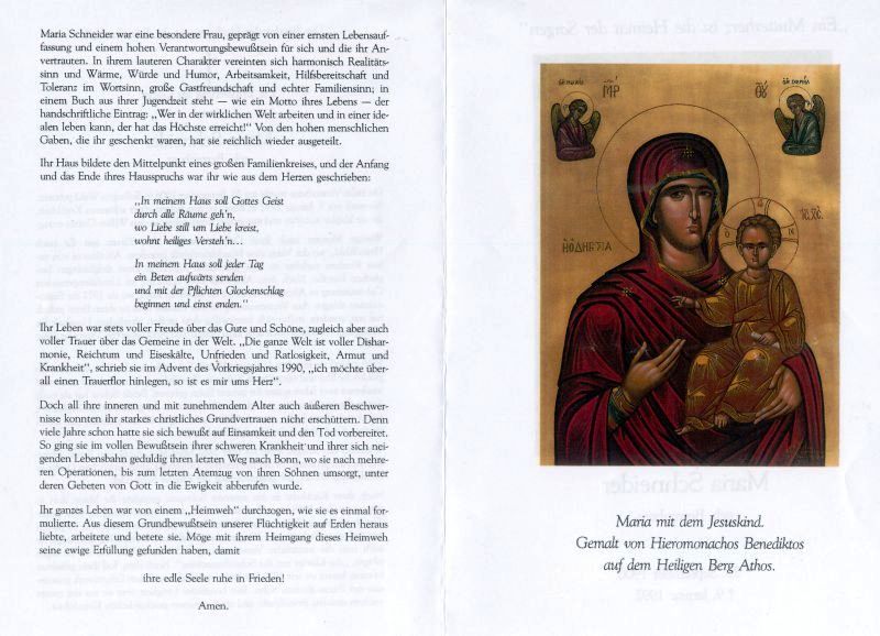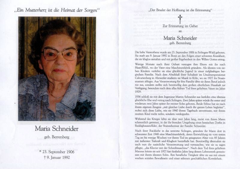 | Kindheit in Haan/Rhld., wo Vater, † 1929, Maschinenfabrik gründete; Musikstudium in Köln; ∞ 1936 Ingenieur Martin Schneider aus Iserlohn, † 1977 ; Umzug nach Solingen; 2 Söhne; während des 2. Weltkrieges 2 Jahre in Reddighausen/Eder; 1948 gründete ihr Mann in Solingen Maschinenfabrik, die sie nach dessen Tod fast 15 J. mit ältestem Sohn leitete;schwere Krankheit |