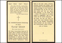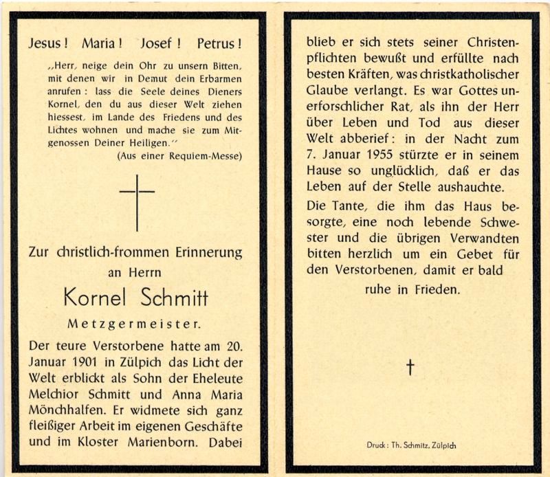 Tod durch Sturz in seinem Hause; Eltern: Melchior Schmitt u. Anna Maria geb. Mönchhalfen; Arbeit im eigenen Geschäft und im Kloster Marienborn in Hoven b. Zülpich; unverheiratet |
