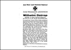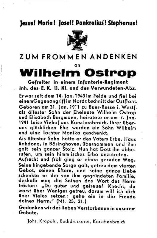 Gefallener 2. Weltkrieg; Eltern: Wilhelm Ostrop u. Elisabeth geb. Bergmann; ∞ 7.1.1941 Luise Viehof aus Korschenbroich; 2 K. (Wilhelm, Monika); hatte als ältester Sohn das väterl. Erbe Haus Rahdong in Bösinghoven übernommen |
