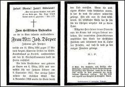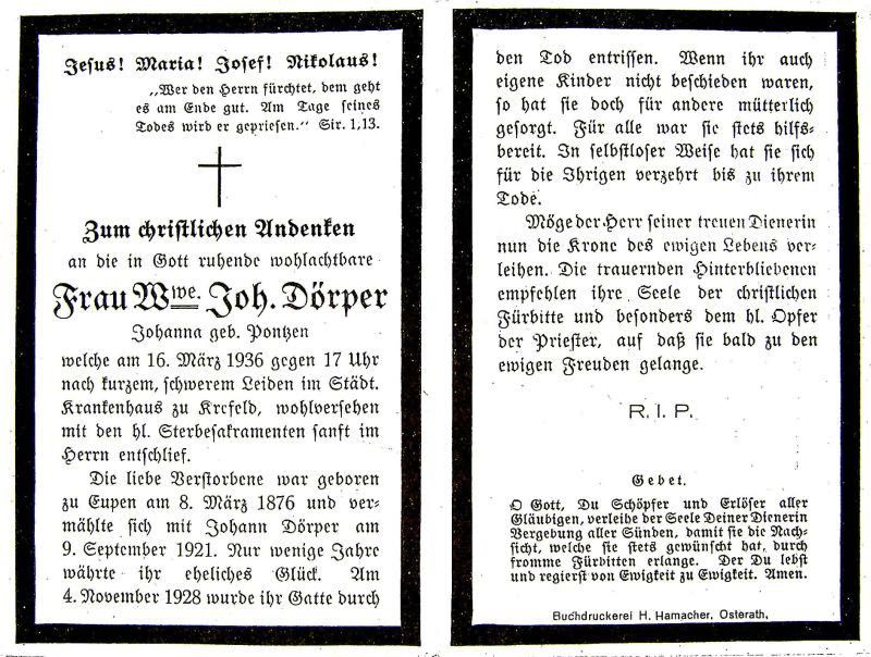 ∞ 9.9.1921 Johann Dörper, † 4.11.1928; kinderlos; Druck in Osterath |