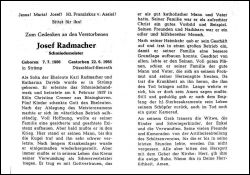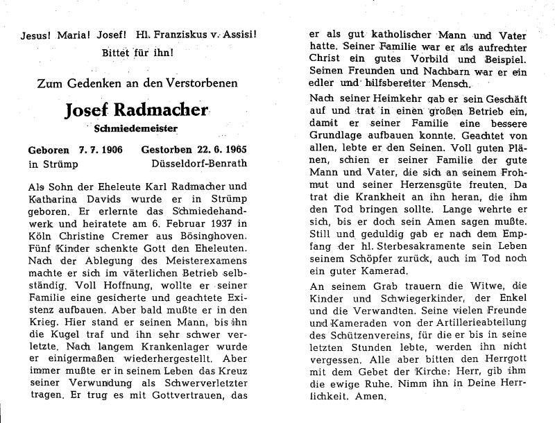 Schmiedemeister; ∞ 6.2.1937 in Köln Christine Cremer aus Bösinghoven; 5 K.; übernahm väterl. Betrieb; Im 2. Weltkrieg schwer verletzt, trug daran sein Leben lang; Opfer 2. Weltkrieg; nach der Heimkehr gab er seinen selbständigen Betrieb auf, trat in einen großen Betrieb ein; |