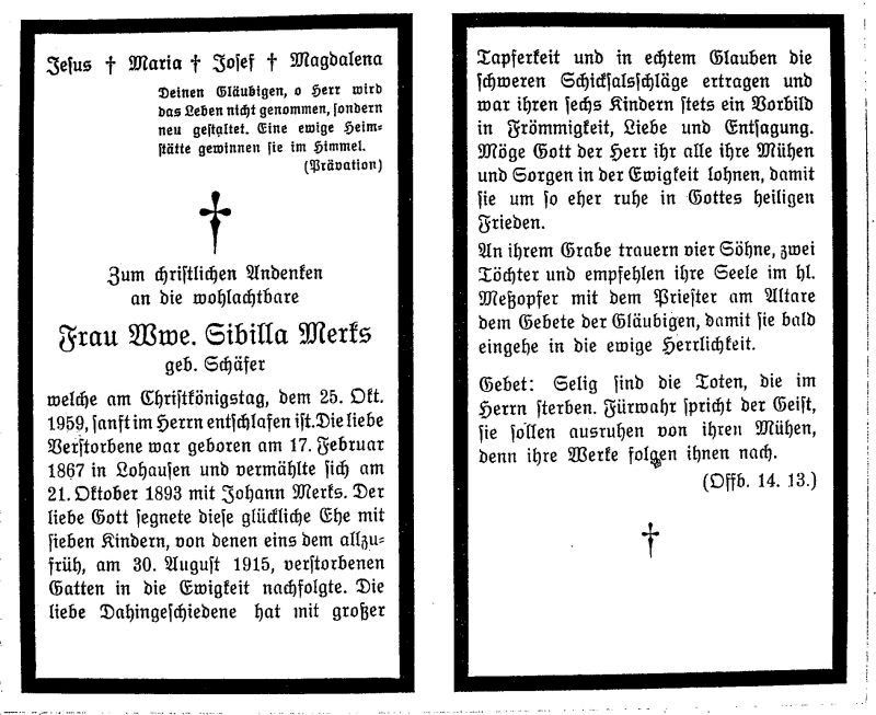 ∞ 21.10.1893 Johann Merks, † 30.8.1915; 7 K., davon 1 †; schwere Schicksalsschläge |