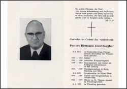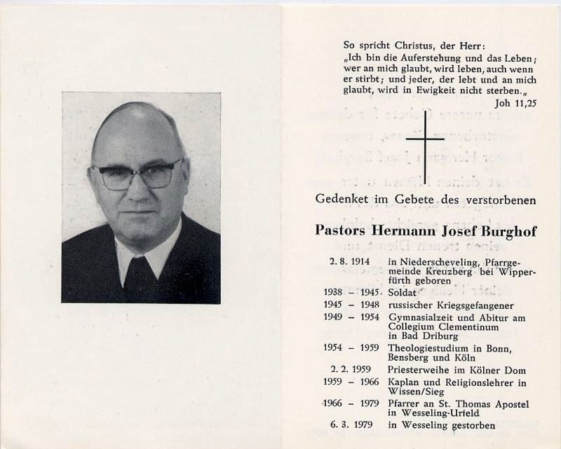 1938-45 Soldat im 2. Weltkrieg; 1945-48 russ. Kriegsgefangenschaft; 1949-54 Collegium Clementinum in Bad Driburg, Abitur; 2.2.1959 Priesterweihe Köln; 1959-66 Kaplan in Wissen/Sieg; 1966-79 Pfarrer in Wesseling-Urfeld; Exequien und Beerdigung in Urfeld |