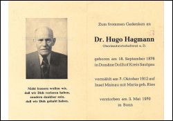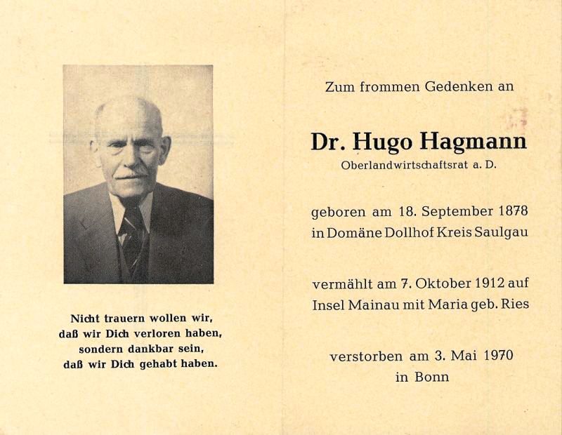 Oberlandwirtschaftsrat a. D.; ∞ 7.10.1912 auf Insel Mainau Maria Ries; Exequien und Beerdigung in Urfeld |