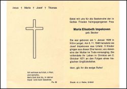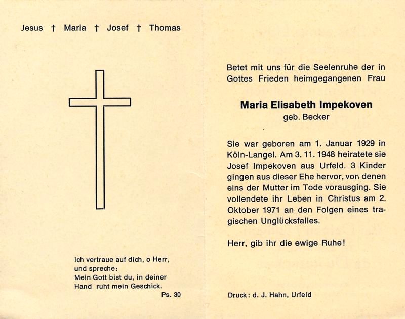 Tod durch Unglücksfall; ∞ 3.11.1948 Josef Impekoven aus Urfeld; 3 K., davon 1 † ; Exequien und Beerdigung in Urfeld |