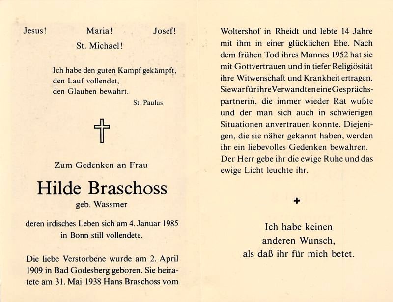 ∞ 31.5.1938 Hans Braschoss vom Wotershof in Rheidt, † 1952; Krankheit |