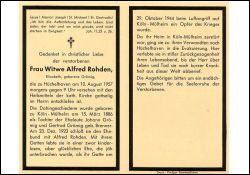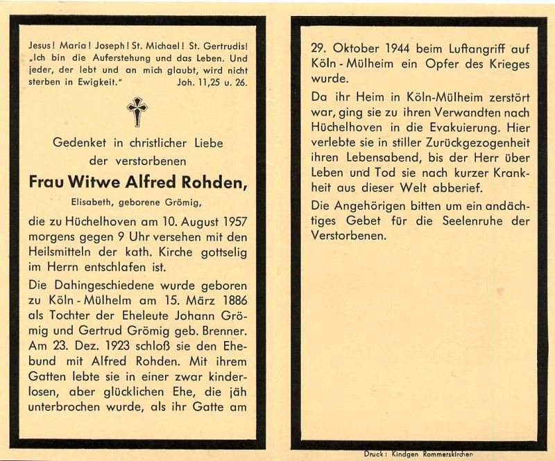 Eltern: Johann Grömig u. Gertrud geb. Brenner; ∞ 23.12.1923 Alfred Rohden; kinderlos; Gatte Opfer 2. Weltkrieg: Tod b. Luftangriff am 29.10.1944 auf Köln-Mülheim; Haus zerstört; zog zu Verwandten nach Hüchelhoven |