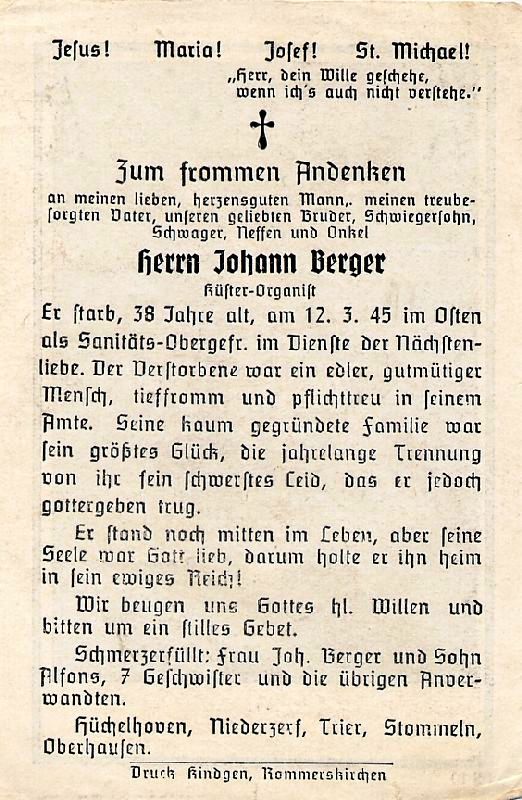 Gefallener 2. Weltkrieg; Sanitäter; 38 J.; Küster-Organist; verh., Sohn Alfons; Druck in Rommerskirchen |