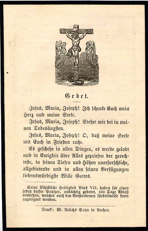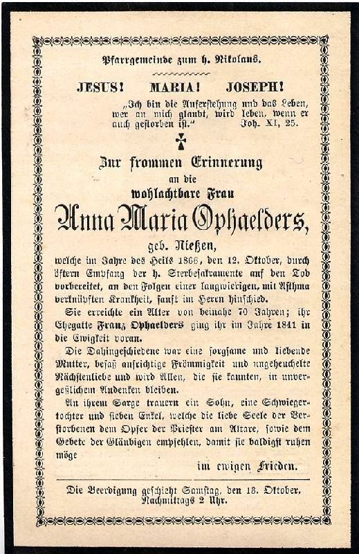 Fast 70 J.; langwieirge Krankheit: Asthma; ∞ Franz Ophaelders, † 1841; 1 überlebender Sohn; Pfarrgemeinde St. Nikolaus |