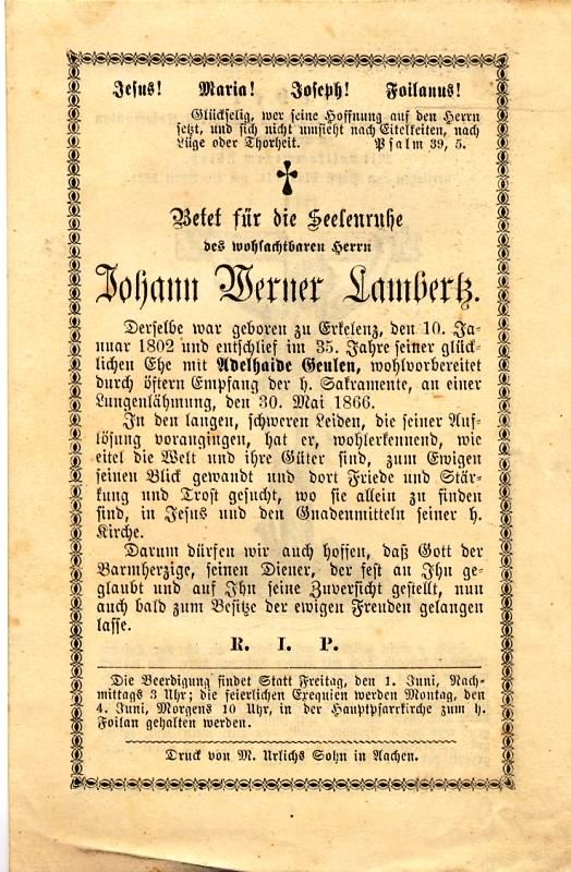 Lungenlähmung; 35 J. verh. Mit Adelhaide Geulen; langes, schweres Leiden; Exequien in Aachen |
